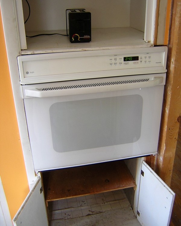 This is the new oven, all installed. You can see that I had to cut away some of the frame to get it in there. Also I had to do some work under it. The old oven was resting on two 2x4's, on a thin piece of plywood, which was unsupported at one corner! Ten inches below this was a shelf made of a thicker piece of plywood. I removed the 2x4's to create enough vertical room for the larger oven, switched the two pieces of plywood so the stronger one supported the oven, did some sawing to make both shelves fit, and nailed in some scrap wood to support them better.