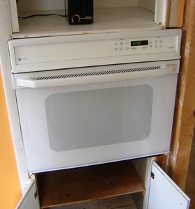 Houseblog: the Oven Job -- 25 August 2011 -- Most houses have the oven and stove as a single unit. In my house they were separate, with an electric four-burner stove on top of a cabinet, and an electric oven a few feet away built into some shelves. The stove worked, but it stuck out too far and made the kitchen smaller. That's for another post. The oven was in a good place, but it did not work. It was obvious why the bake element didn't work -- a few inches were completely burned away, with drops of metal underneath. I went to the local Reliable Parts store and bought a new one and installed it. It still didn't work, and I wasn't surprised, because the broil element also didn't work, for no apparent reason. A little red light by the switch came on, but no heat.