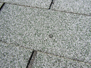 dimple on one of the shingles. Underneath I found this. Apparently one of the nails worked itself loose and fell out, and on the way it made a tiny hole in the shingle above it, conveniently matching the hole below.