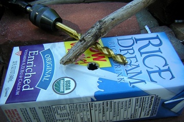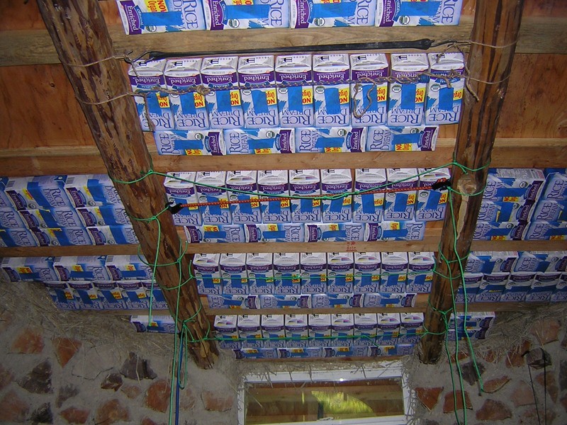 Landblog: Hut Roof Insulation -- 19 September 2011 -- I've done almost nothing on the land this year except this one little project, which was mostly done by Troy. The idea was to insulate the underside of the hut roof with a bunch of empty rice milk cartons. So, how do you attach cartons to the bottom of a piece of plywood? The normal way would be a bunch of toxic goop, but I wanted to do it with thumbtacks. This turned out to be difficult. Thumbtacks are made for cork board, not plywood. You need to drive the tack hard and straight. How can you do that from the inside of a carton?