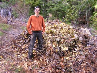 Leaves -- 10 November 09 -- Early November is leaf trading season in Spokane, and right now the market runs the whole range from "I can't believe you'll haul my bagged leaves away for free" to "If you want them, you have to rake them yourself and I'll be watching." I don't think that guy got any takers, but in a few years, when more people are growing their own food and needing to build topsoil, he might. This year it was no problem for me to make four leaf runs around the city and haul up three truckloads in five days, a total of 47 garbage bags full. I covered six stick piles with leaf hats, which will keep the sticks moist and warm so they break down faster, and also made a four foot all-leaf pile with enough mass that when I stuck my hand in the center, the heat was uncomfortable.