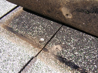 Then I went back on the roof and found a dimple on one of the shingles. Underneath I found this. Apparently one of the nails worked itself loose and fell out, and on the way it made a tiny hole in the shingle above it, conveniently matching the hole below.