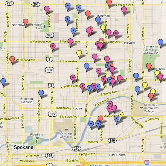 After deciding to stay in Spokane, I had to narrow down the location. The suburbs are right out: they lack both natural aliveness and urban aliveness, and you need a car to get anywhere. I wanted to be deep enough in the city that I could easily ride my bike around, but also close enough to the highway for an easy drive north.