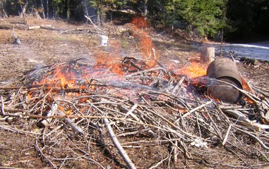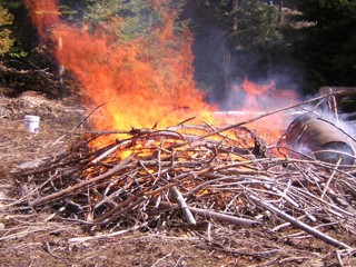 Slash Burn 2010 -- 25 February 2010 -- If you've never set fire to a pile of dry branches the size of a large car, I recommend it. This is the scariest picture I took, and it still doesn't look like much, and it's nothing compared to a forest fire, but even a fire this size is scary! It's surprisingly loud, hot, and violent. This is mostly the limbs of the two western hemlocks that fell a couple years ago. You can see the pile on the right side of this photo from last June. I covered it with a tarp over the winter to keep it dry, and stuck in a barrel that needed to be burned clean. Two days ago I drove up early, walked in the last mile, and lit it up with a rag soaked in alcohol. That fire went out! So I lit another fire, and then another. You really have to build a small campfire inside the pile. But then at a certain point, it takes off fast.