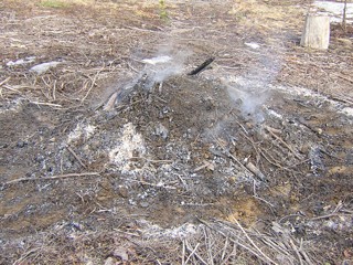 If you're doing this in cold, damp weather, as you should, the wood at the edges of the pile will not burn. Maybe 20 minutes after the above photo, you can see here that the fire has gone down and has just eaten out the center of the pile. About ten minutes after this, it finally cooled down enough that I could get close enough to throw most of the edge wood into the center with a shovel. In this photo and the above, you can see a five gallon bucket full of water, one of three that I set around the perimeter in case the fire spread, which turned out to be completely unnecessary this early in the year.