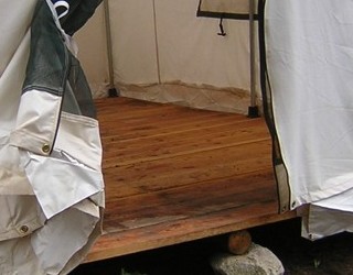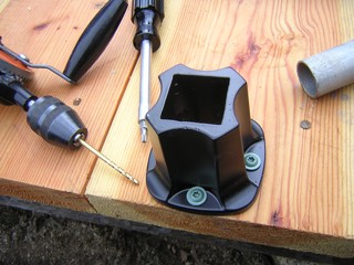 How to attach a wall tent to a platform -- 15 April 2010 -- Last summer I made a tent platform, and that link goes to the post about it. I decided to make the platform exactly fit the inside of the tent, so that the legs could sit up on it and the walls could drop down over the edges. But this spring, before I could put the tent on the platform and sleep in it, I had to figure out how to get it to stay on. It's not just that the wind might blow it off, but that the bottoms of the six legs need to be held in with some tension to make the walls fit and allow the zipper to close. My first idea was to carve holes in the platform, an inch diameter and a half inch deep. But I was afraid that wouldn't be deep enough, and any deeper could break the wood, which is only an inch and a half thick. My next idea was to cut a board into squares, drill one inch holes all the way through, and screw them to the platform. Then Charlie had an idea that was easier and more sturdy, but also more expensive. He suggested using a "flange".