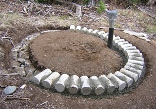And here's what went on top: the concrete test cylinders that I picked up last August. This was how far eight bags got us. Yes, I rinsed the dirt off before putting the concrete on. Also, I covered all this up with wet leaves to keep it moist so it could cure better. And I'm going to have to throw in lava rock and dig a trench to carry off water that would otherwise fill the foundation and freeze next winter. To find out how much the frost under the foundation will damage the structure, is one of the things this structure was designed for.
