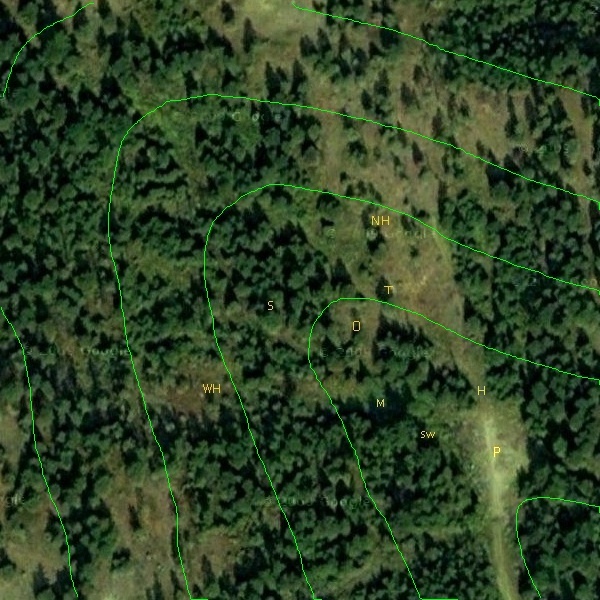 This is from a satellite image taken in summer of 2006, with notation added in March and December 2010. NH is the north hill, WH is the west hill, S is the spring, T is the tent platform, and O is the main orchard, although I've planted stuff all over the bottomlands. Farther down, M is the dense reed canarygrass that I call the meadow, Sw is the swampy area, P is the disturbed area I call the parking lot, and H is the cobwood hut. The lowest elevation line is 2640 feet and the highest is 2800. The actual property lines are maybe 60 feet inside the edges of the image, which covers roughly 800x800 feet.