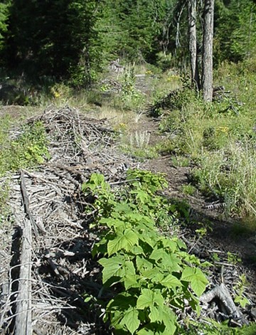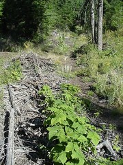 But the main thing I did, over the whole week, was continue to clear dead wood off the ground and throw it in piles. Here's a photo with a lot of information. This is looking west by northwest from the bottom of the north hill. On the left is what all the open areas on the land looked like when I started -- OK, maybe not quite that bad. On the right, and receding into the distance, is a trail I cleared by throwing the wood, one piece at a time, into piles, and on the left you can see a smaller pile. Also, there in the foreground is a patch of thimbleberries, so far all leaves and no actual berries. And just past the pile is where I'm thinking of building the cabin.