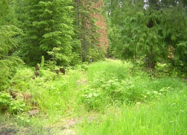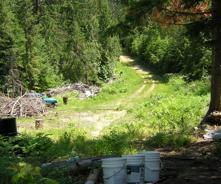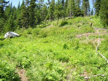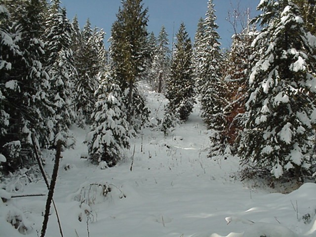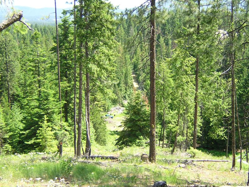 When you're driving to the land, this is what it looks like when you first see it. The south boundary is just this side of the two red posts. Those brown trees in the center were killed by heat when I burned the big slash pile that was in front of them. Behind them is the north hill, with the north line roughly at the ridge on top, 660 feet from the south line.