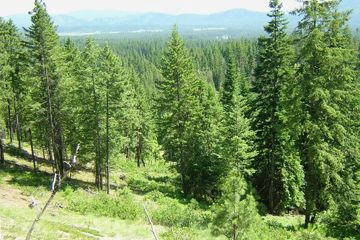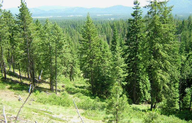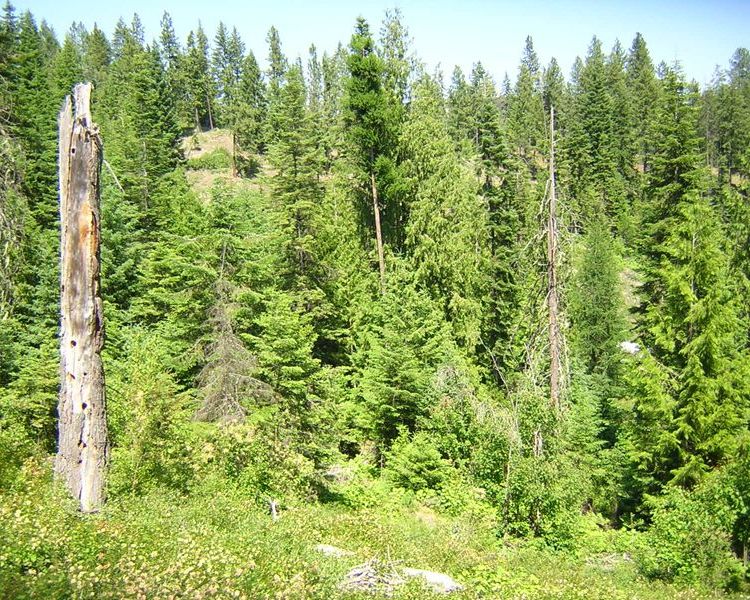 Now we've climbed up to beyond the tall stump, which you see on the left. We're looking north by northeast, down the west hill and up the north hill. The main trees in the canyon are grand fir, western redcedar, douglas fir, and western hemlock.
