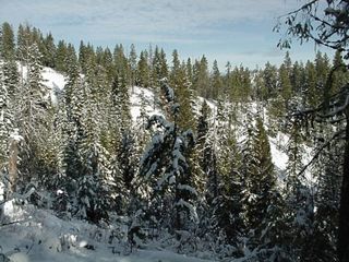 The west hill. All it needs is a little cabin in the middle and it's a Christmas card photo. The sun is out and the temperature is getting above freezing for the first time in a couple weeks, and powdery snow is falling everywhere from the trees.