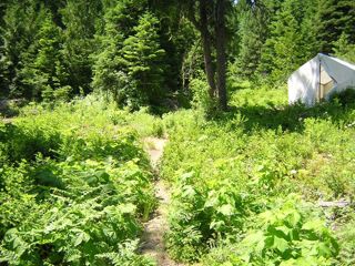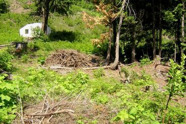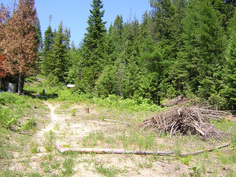 Here's what I call the parking lot. Before the logging in summer of 2002, there was dense forest here. When I first saw it two years later, it was still completely dead, but now it's coming back. That pile of sticks is made of branches from two western hemlocks that fell in early 2007. Wood from those trees made the lower half of the cobwood hut.