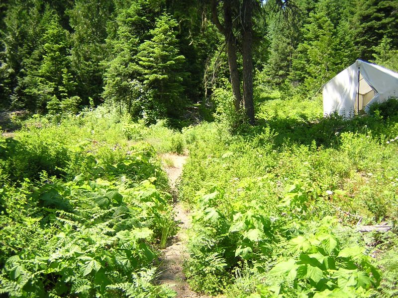 The north hill in June, with my new canvas tent where I was originally planning to build the cabin. In September, the dominant color will be dull brown. The main native plants on the north hill are snowberry, mallow ninebark, baldhip rose, spreading dogbane, and snowbrush ceanothus.