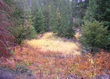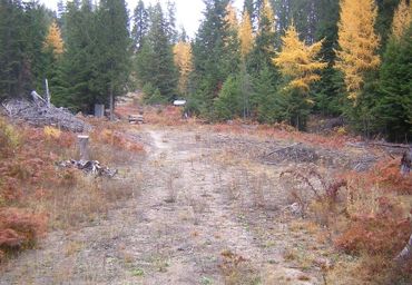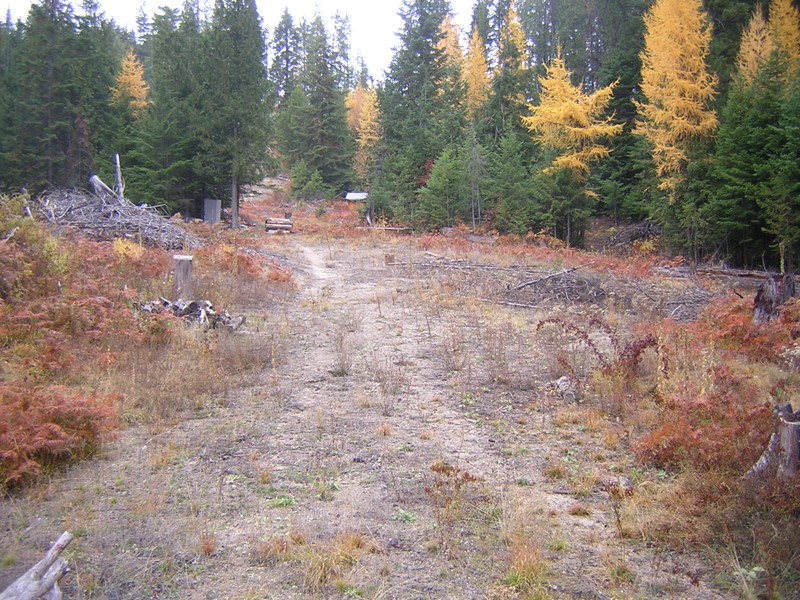 The next few shots are from early November 2008. Here's the parking lot area, and notice that the big slash pile has not burned and killed the trees yet. Those bright yellow trees are western larch, a decidous conifer.