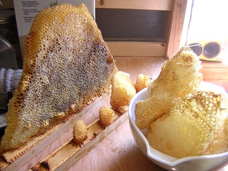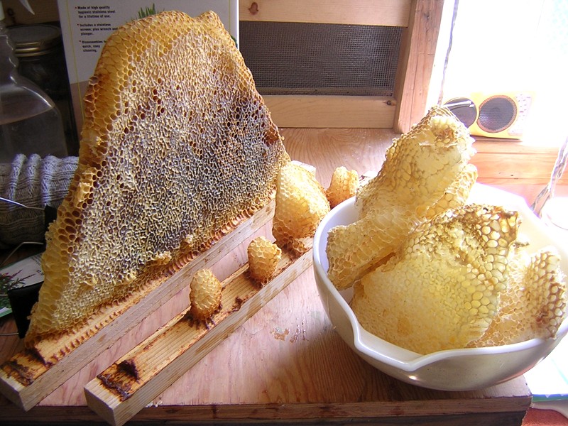 I opened the #1 hive again and gave them much more space and cleaned out a bunch of crazy honeycomb. In the photo you can see an ideal honeycomb on the left, and a bar with some erratic bulging combs that will lead to cross-combing, and a bowl full of comb that was not even connected to bars but I had to dig it out of the back of the hive. If bees are making brood comb, they will make cells no deeper than the length of a bee. But if they plan to use it only for honey, they might make the cells much deeper and the combs much thicker. I pressed all this and got another quart, plus I kept a couple inches of good comb on the bar in case I want to stick it back in a hive later for feeding.