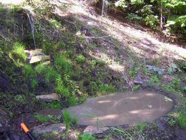 here for a big photo that shows the water flowing into the lower pool. Last year when I did this, a lot of water overflowed the lower pool and ran down the trail. I'd like to get the overflow into a third pool, and I thought about turning the trail into a stream and building a bridge over it, but that's a huge job, and I decided instead to build some kind of tiny streambed that would take the water over the trail at the top. And when I saw how slow the pipe was running, I decided to do it on this trip.