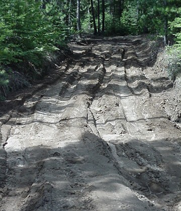 I had to walk them in. Early yesterday morning I loaded the car, stopped to buy peat moss for the blueberries, and drove north. An hour later, where the gravel gave way to dirt, I started walking with just a small backpack and the two long heavy seedling packages. Luckily I didn't have to walk the whole distance. A grey-haired brown-skinned couple in a pickup truck stopped and offered me a ride. I climbed in the back and watched the truck slowly navigate almost a mile of ten inch deep soft mud ruts. Then they dropped me off and I walked the last mile. The whole road isn't as bad as this photo, but this part is even worse than it looks.