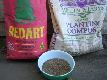 how to make seedballs, and here's a photo of the ingredients I assembled. Dry powdered red clay is not easy to find! Spokane is the metropolitan center of a large region, and I could only find one place that sold dry clay, and I had to go there in person to find out they had red clay, and then the smallest quantity they sold was a 50 pound bag for $27. But it made me very happy because there's not much clay in this area, especially on my land, so it feels like I got a great price on a precious commodity, and now I can make a