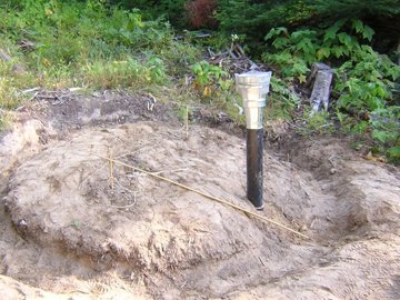 At the top of the vertical pipe are a couple stovepipe parts, and a screen made of quarter inch hardware cloth held on with a hose clamp. The pipe in the ground is buried almost two feet deep, and underneath it Chuck put five gallons of gravel. If I had to do it again I'd use ten or fifteen gallons, but five was all we had, and it should still work because the soil at that depth is almost pure sand. Then we put the silty upper soil back in the trench.