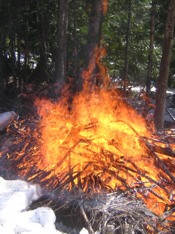 The wood was not that dry, and the fire would have gone out if I hadn't kept feeding it small dry branches, but then in the space of a few seconds it took off, and in a minute it got scary! At the peak, the flames were 15 feet high and I had to stand 30 feet back to not get burned. This picture was taken a few minutes later after it had gone down a bit. Now I have a better sense of how powerful and deadly a summer forest fire would be. To reduce the danger, I'll try to burn as many slash piles as possible before the dry season. For the piles near this one, I can use this burned spot as the base and throw the other wood onto it, so I don't singe other trees and kill other patches of ground. And I can make another burn-base in the "parking lot" for the bigger piles.
