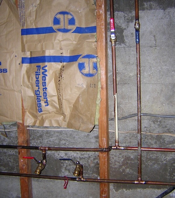Epic Plumbing -- 7 June 2012 -- This house has been a plumbing challenge from the beginning. Even before I bought it, I knew from the HUD inspection that the lines didn't hold water. There turned out to be a big leak from the front outside hose faucet, a moderate leak from the dishwasher connection under the kitchen sink, and several minor leaks. When I got back from my winter tour, I noticed a leak in the basement where a PVC pipe connected to a brass shutoff valve. Rather than fix it, I decided to tear out all the PVC supply pipes in the basement and replace them with soldered half inch copper.