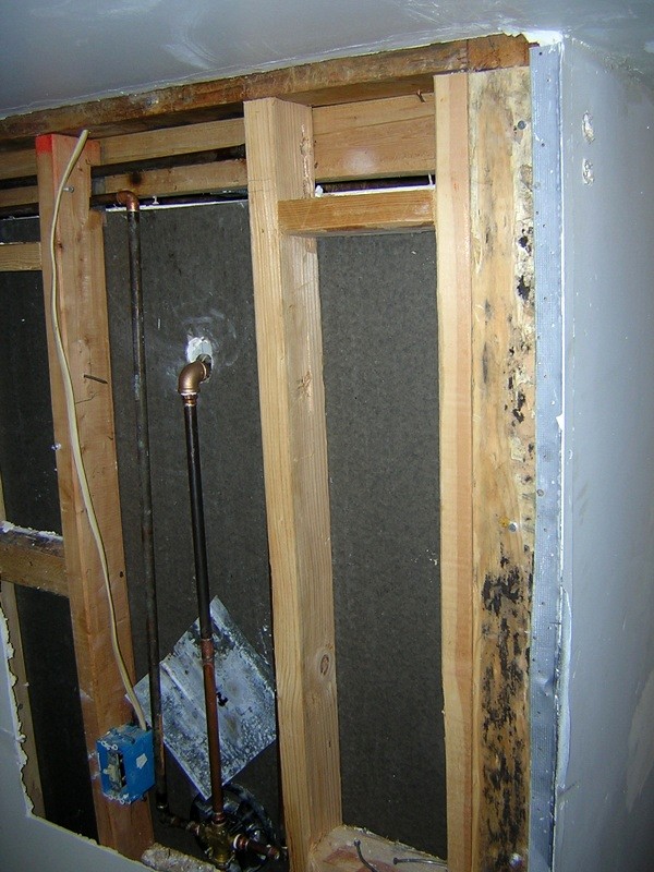 Here's a photo with another complication. This is the back of the shower, and if you look in the upper right you can see two holes I drilled in the wall. This was the easiest way to feed the pipes into the wall. Otherwise I would have had to tear the whole wall apart, drywall and studs, or else use a bunch of small pipes connected together. Even doing it this way, I had to use two sections for each pipe, because the wall opposite the holes is only 37 inches away, so anything longer could not get in position to slide into the hole.