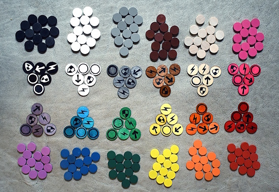 On the right are my presence tokens and reminder tokens. Along the bottom of the image are the six colors of presence tokens that come with the game. Along the top are six more colors that I ordered from a game supplier, colored wooden discs slightly larger (15mm x 4mm) than the originals. In the middle are reminder tokens in all twelve colors, which I made from 20mm unfinished wooden discs, colored with Copic markers and inked with black pens (except the white on black which was black sharpie and white out) then coated with clear satin spray. This was my big project in the winter of Covid.